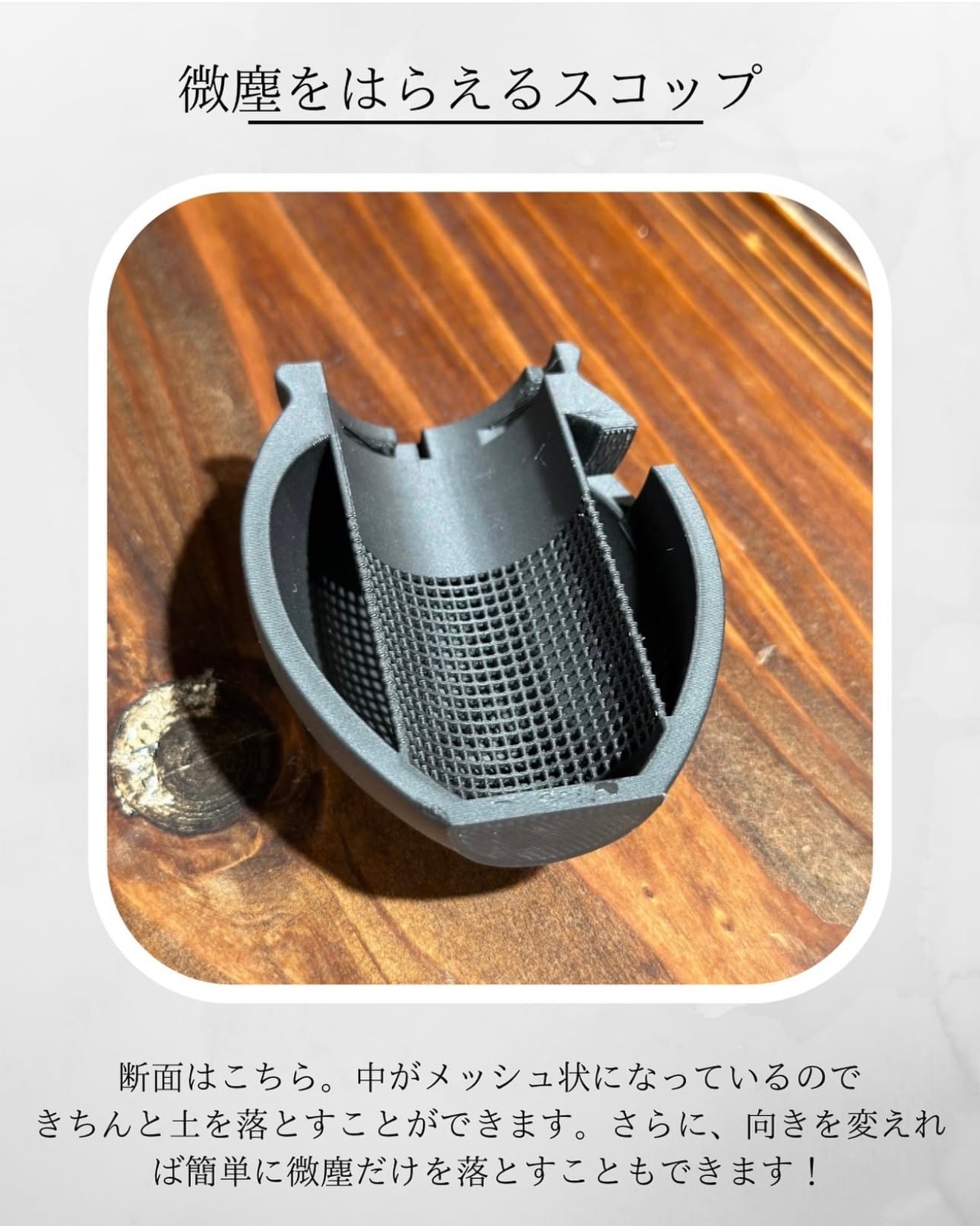 すべての道具をつぼの中にしまっているので、組み合わせてスコップ型に変形させることができます。さらに内部構造として、メッシュ状の振り分け機を導入していることから、土をすくうだけで微塵を払うことができます。